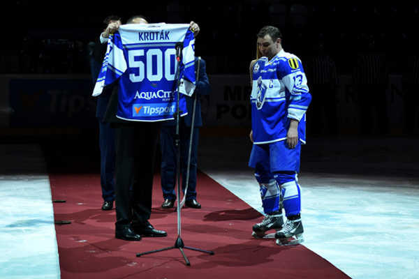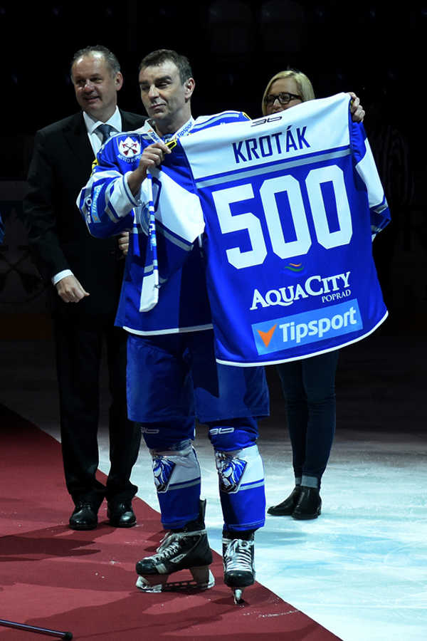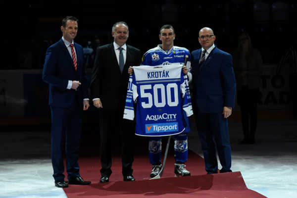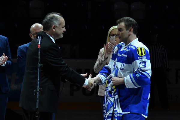 Prezident Andrej Kiska odovzdáva dres s číslom 500 hokejovému útočníkovi Arnemu Krotákovi.
