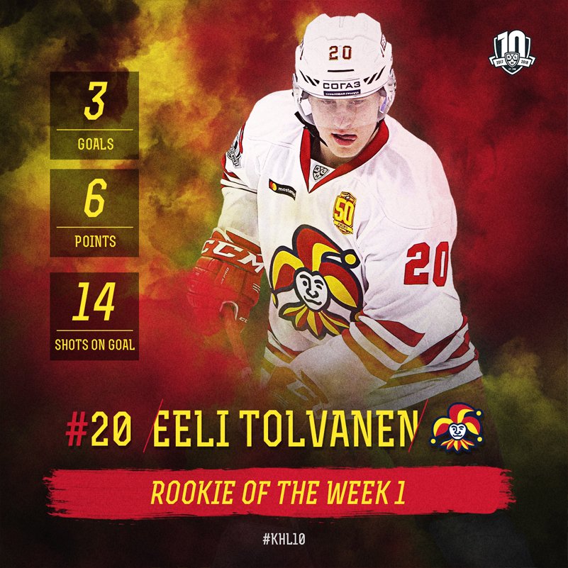 Za najlepšieho nováčika vyhlásili Eeliho Tolvanena z Jokeritu Helsinki. Dvadsaťsedemročný Furch dosiahol v troch dueloch tri víťazstvá a raz vychytal čisté konto. Za prvý týždeň mal vynikajúci priemer 0,66 gólu na zápas a 97,3 percentnú úspešnosť zákrokov. Dvadsaťdvaročný Verešagin odohral v prvom týždni taktiež tri zápasy, so Sibirom trikrát vyhral a zaznamenal tri asistencie a tri "plusky". Okrem toho zblokoval desať striel, čo bolo najviac v lige za sledované obdobie.